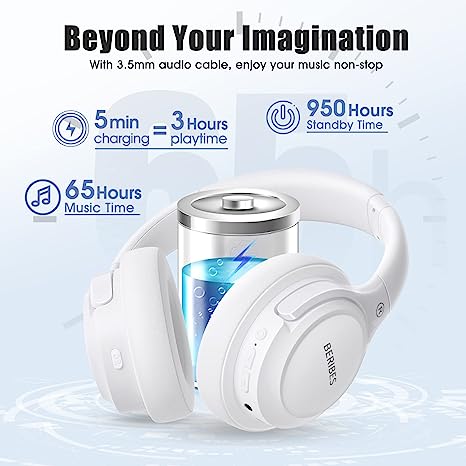 Bluetooth Headphones Over Ear,BERIBES 65H Playtime and 6 EQ Music Modes Wireless Headphones with Microphone,HiFi Stereo Foldable Lightweight Headset,Deep Bass for Home Office Cellphone PC Etc.(White)