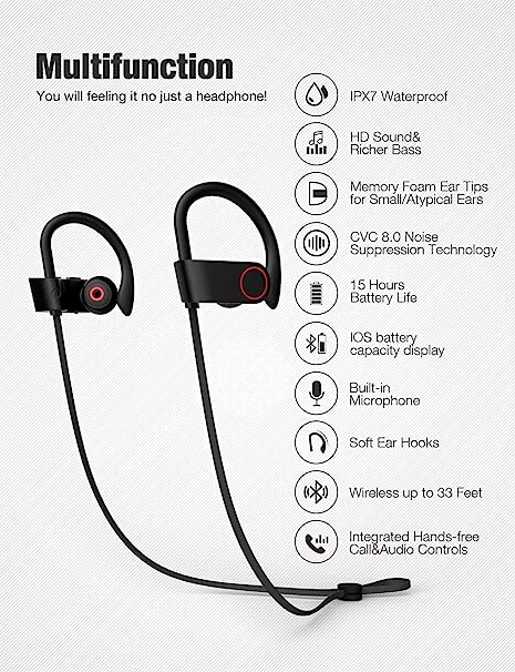 Bluetooth Headphones, Wireless Earbuds IPX7 Waterproof Sports Earphones 15H Playtime with Mic HD Stereo Sound Sweatproof in-Ear Earbuds Sound Isolation Headsets Gym Running Workout
